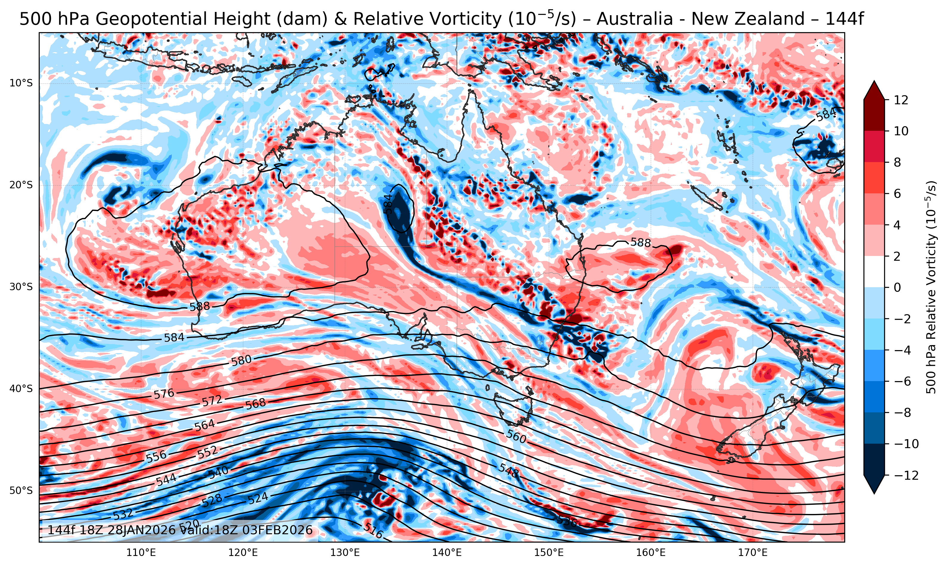 Australia and New Zealand 500 hPa Geopotential Height and Relative Vorticity 144 Forecast