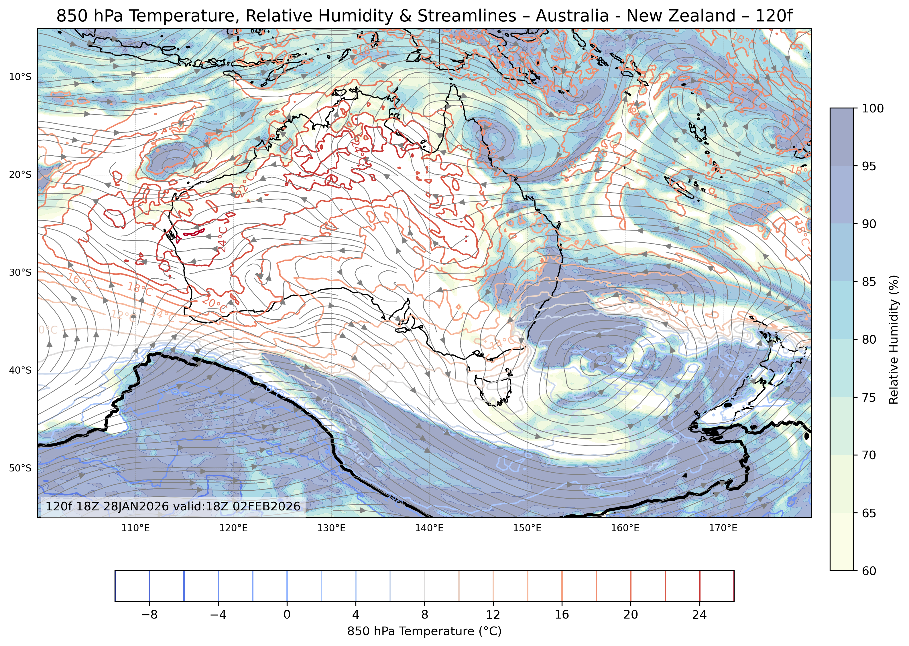 Australia and New Zealand 850mb Temperature Relative Humidity Winds 120 Forecast