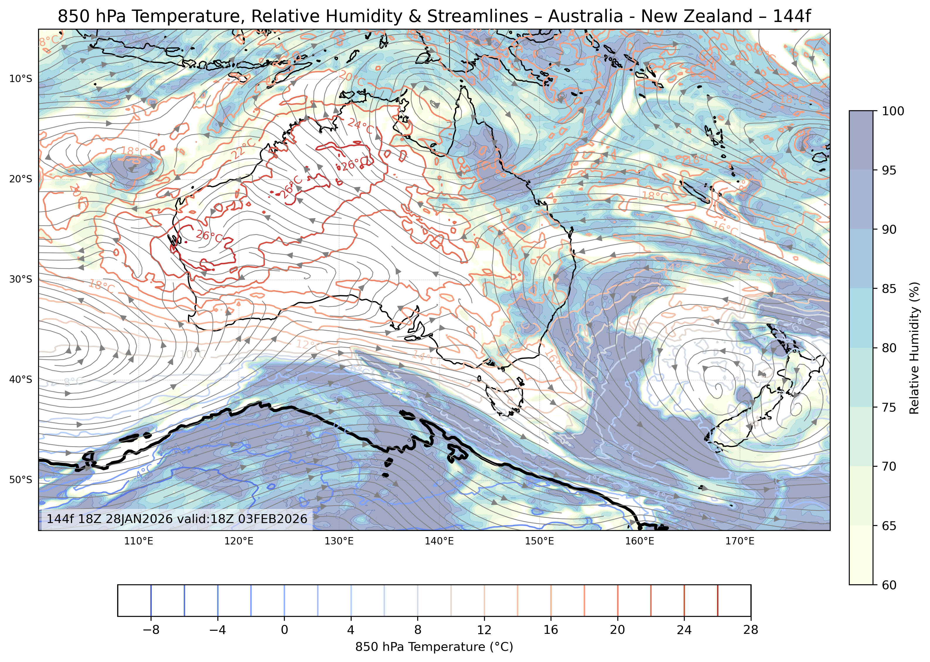 Australia and New Zealand 850mb Temperature Relative Humidity Winds 144 Forecast