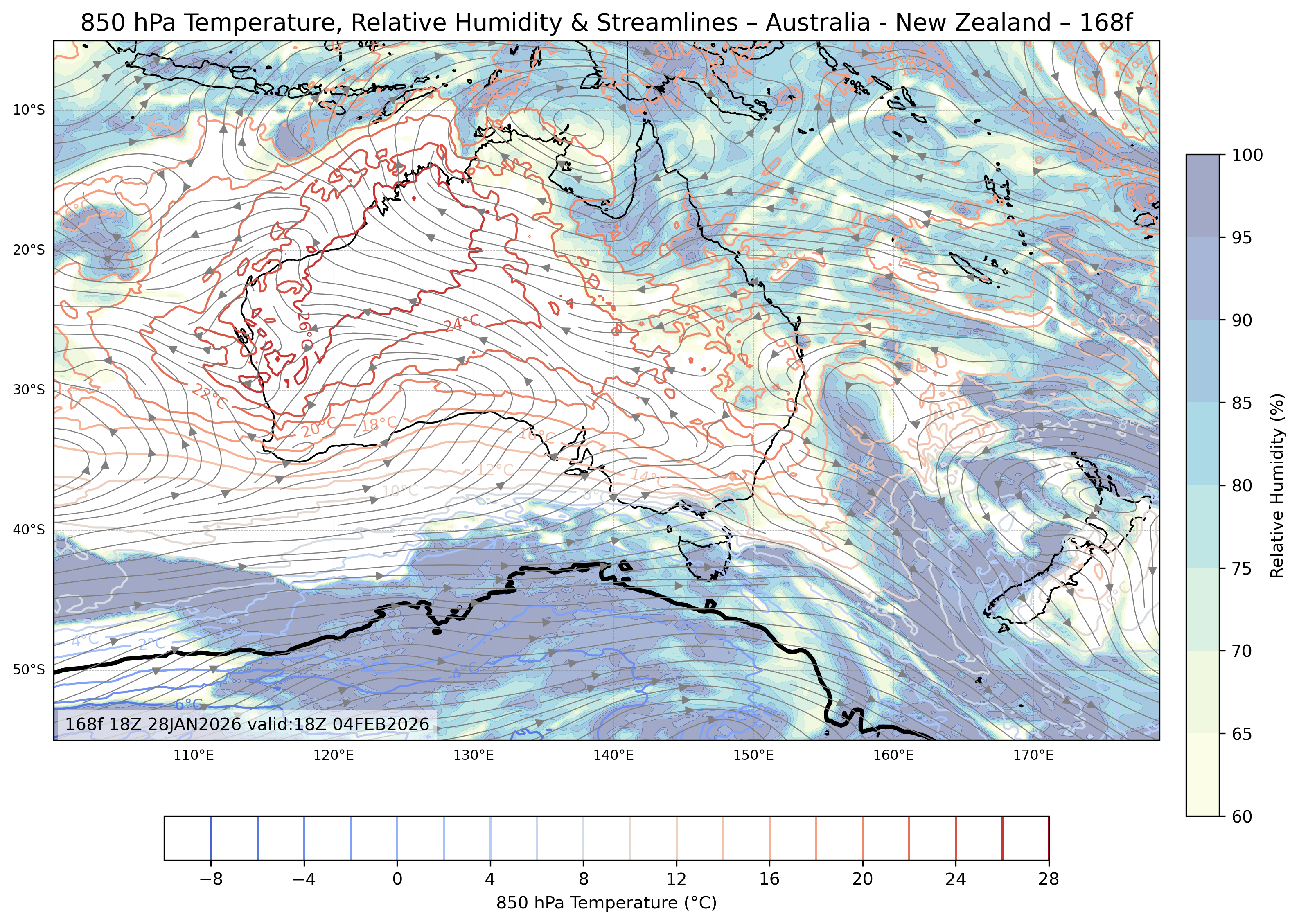 Australia and New Zealand 850mb Temperature Relative Humidity Winds 168 Forecast
