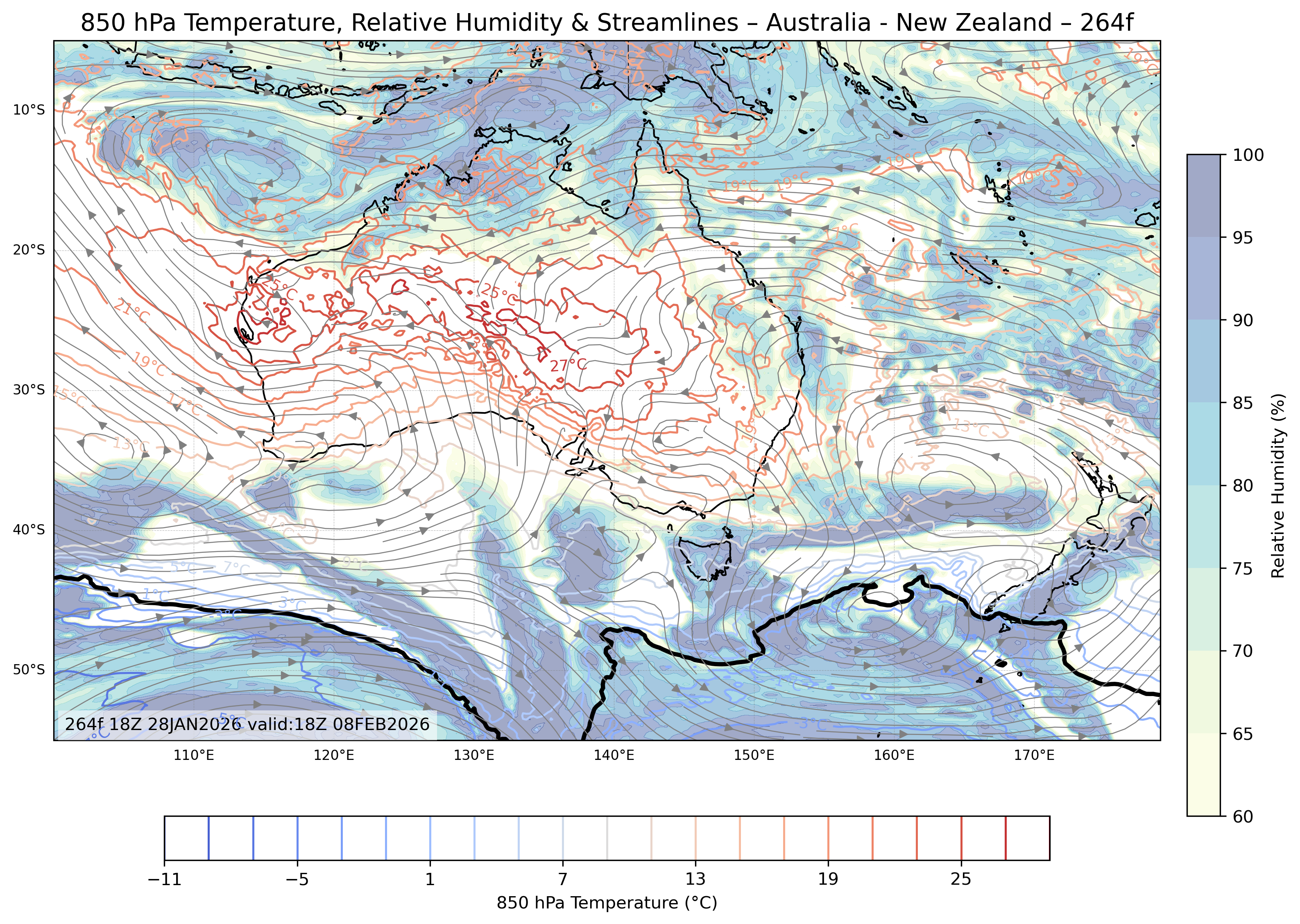 Australia and New Zealand 850mb Temperature Relative Humidity Winds 264 Forecast